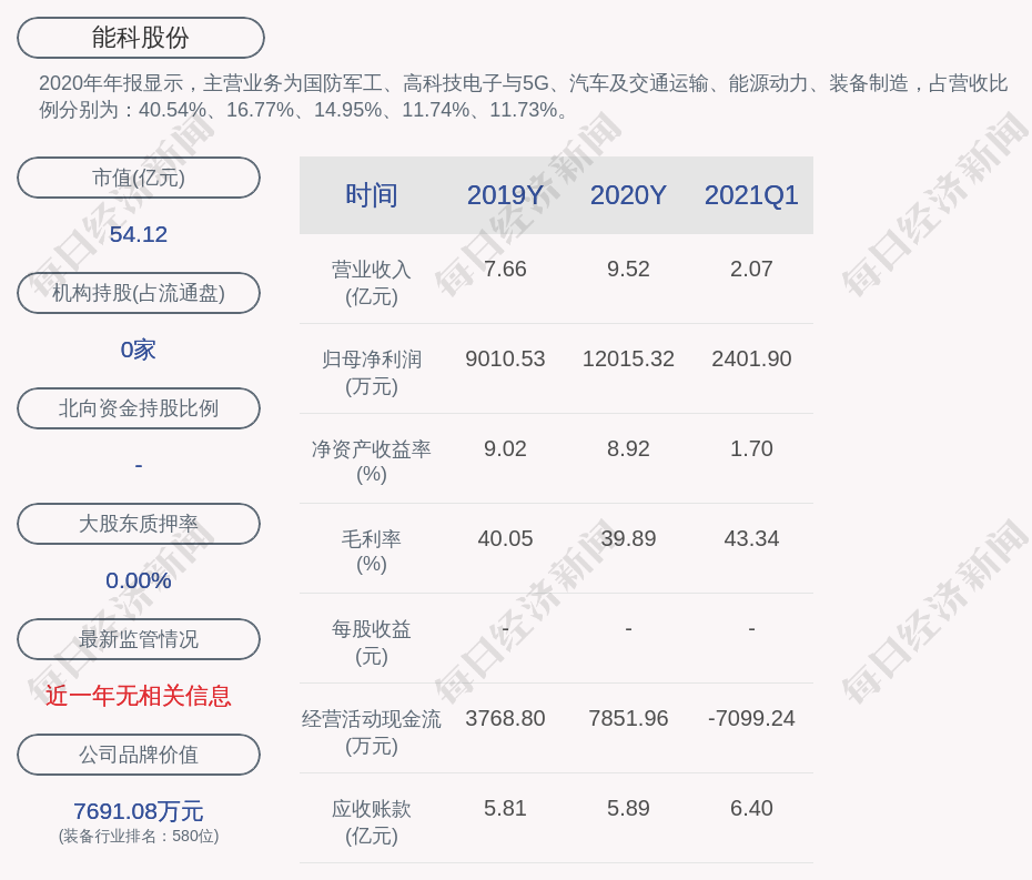 2020年年报显示,能科股份的主营业务为国防军工、高科技电子与5G、汽车及交通运输、能源动力、装备制造,占营收比例分别为:40.54%、16.77%、14.95%、11.74%、11.73%。
