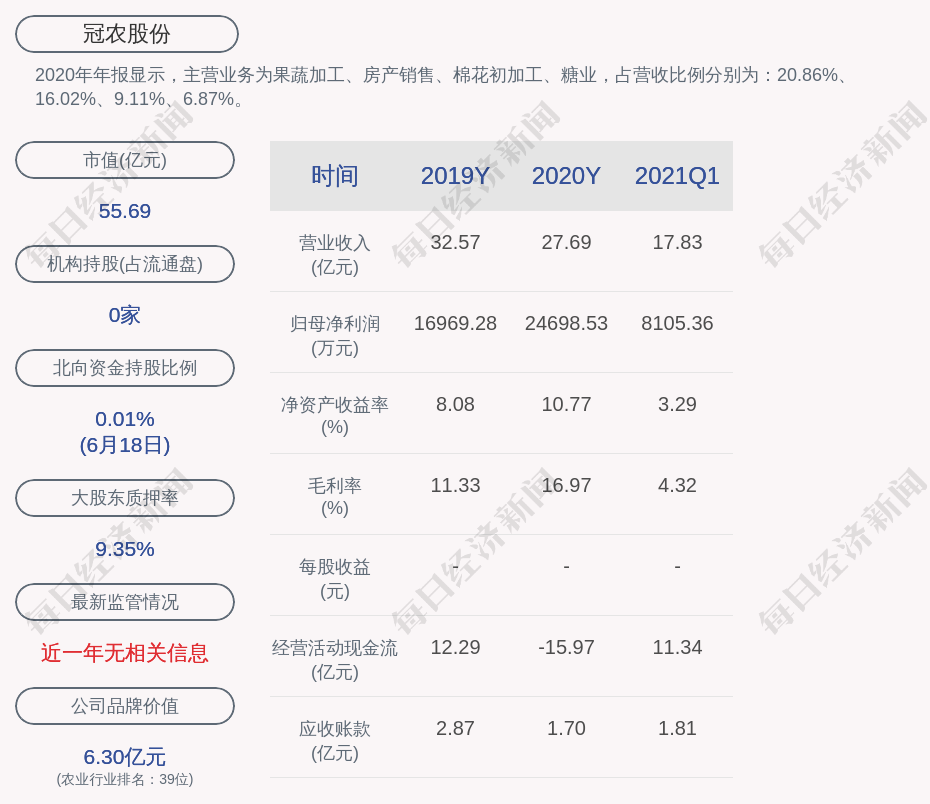 2020年年报显示,冠农股份的主营业务为果蔬加工、房产销售、棉花初加工、糖业,占营收比例分别为:20.86%、16.02%、9.11%、6.87%。