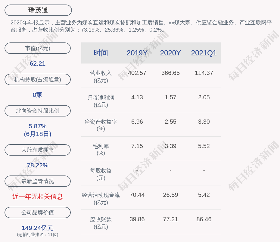 2020年年报显示,瑞茂通的主营业务为煤炭直运和煤炭掺配和加工后销售、非煤大宗、供应链金融业务、产业互联网平台服务,占营收比例分别为:73.19%、25.36%、1.25%、0.2%。