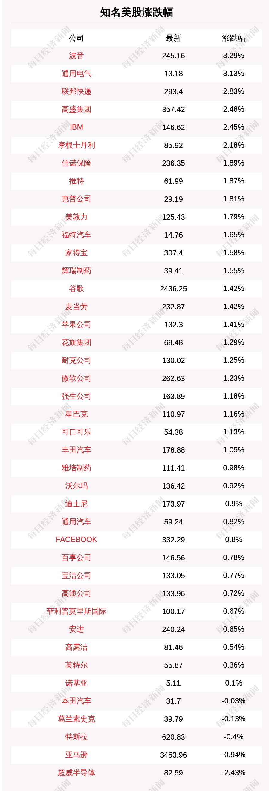 知名美股中波音、通用电气、联邦快递、高盛集团、IBM涨幅居前,收盘分别上涨3.29%、3.13%、2.83%、2.46%、2.45%。超威半导体、亚马逊、特斯拉、葛兰素史克、本田汽车跌幅居前,收盘分别下跌2.43%、0.94%、0.4%、0.13%、0.03%。