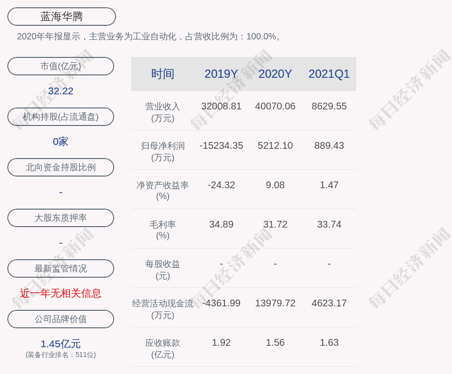 2020年年报显示,蓝海华腾的主营业务为工业自动化,占营收比例为:100.0%。