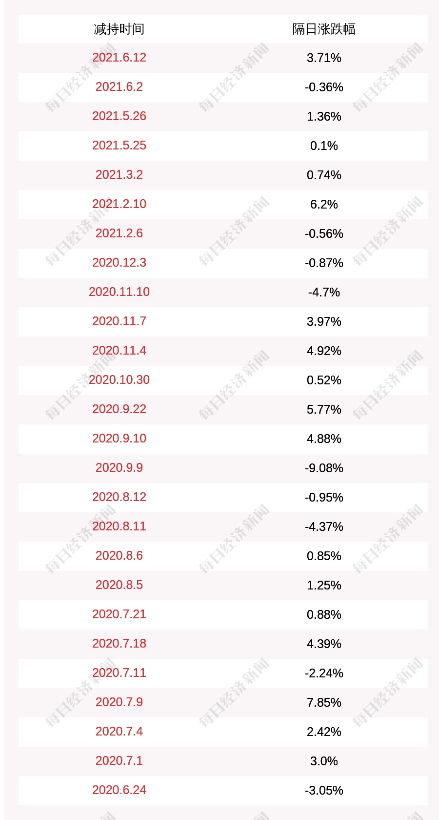 2. 蓝海华腾上次发布减持公告是2021年06月12日,第二个交易日上涨3.71%,蓝海华腾近一年共发布27次减持类公告。更多关键信息,请搜索“道达号”。