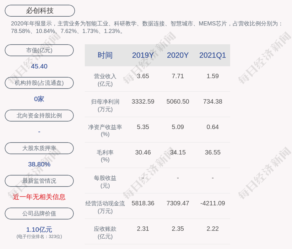 2020年年报显示,必创科技的主营业务为智能工业、科研教学、数据连接、智慧城市、MEMS芯片,占营收比例分别为:78.58%、10.84%、7.62%、1.73%、1.23%。