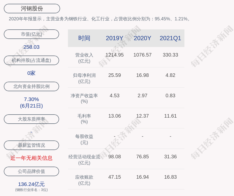 2020年年报显示,河钢股份的主营业务为钢铁行业、化工行业,占营收比例分别为:95.45%、1.21%。