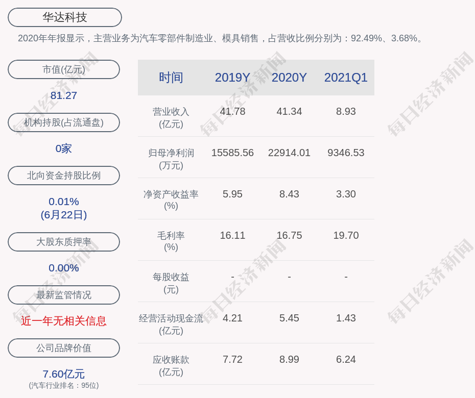 2020年年报显示,华达科技的主营业务为汽车零部件制造业、模具销售。