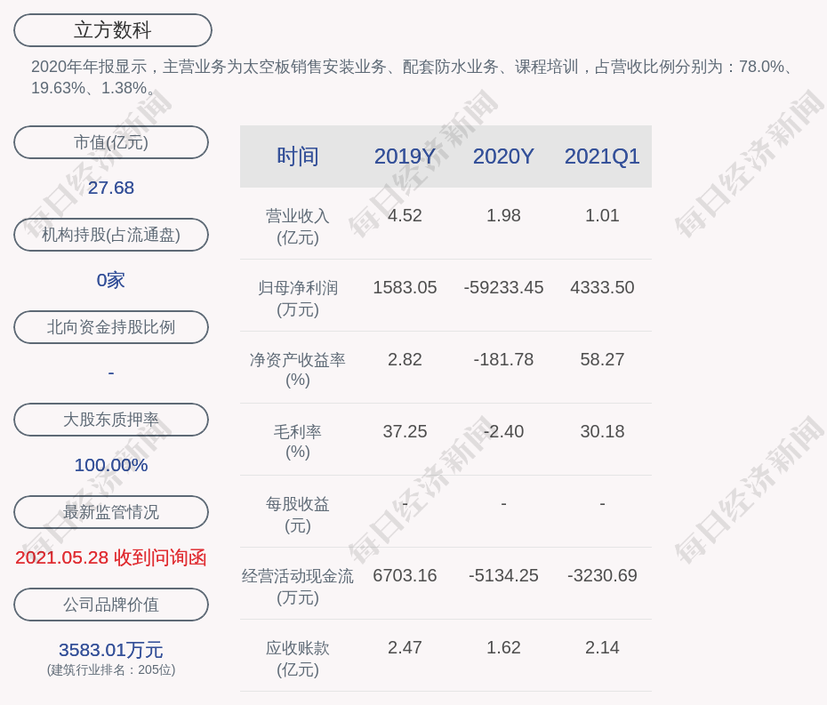 2020年年报显示,立方数科的主营业务为太空板销售安装业务、配套防水业务、课程培训,占营收比例分别为:78.0%、19.63%、1.38%。