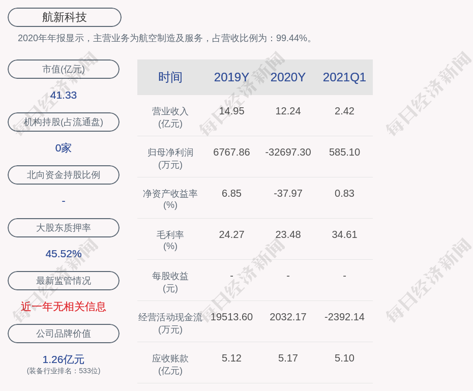2020年年报显示,航新科技的主营业务为航空制造及服务,占营收比例为:99.44%。