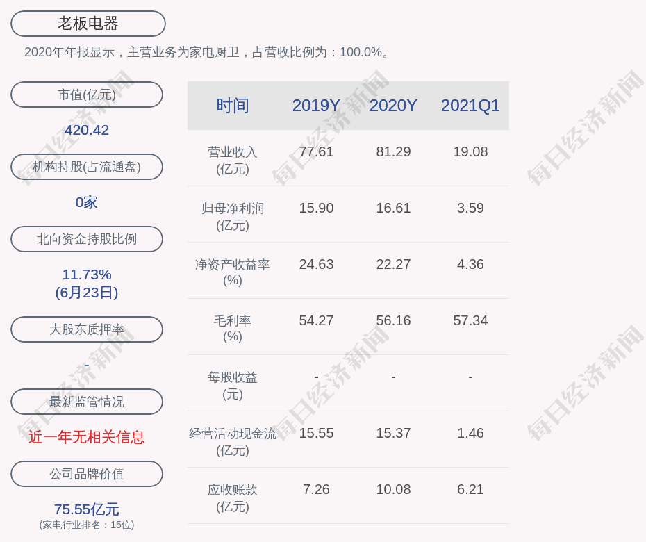 2020年年报显示,老板电器的主营业务为家电厨卫,占营收比例为:100.0%。