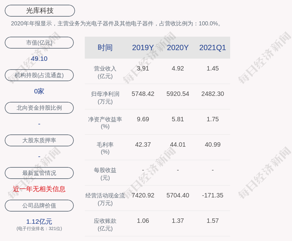 2020年年报显示,光库科技的主营业务为光电子器件及其他电子器件,占营收比例为:100.0%。