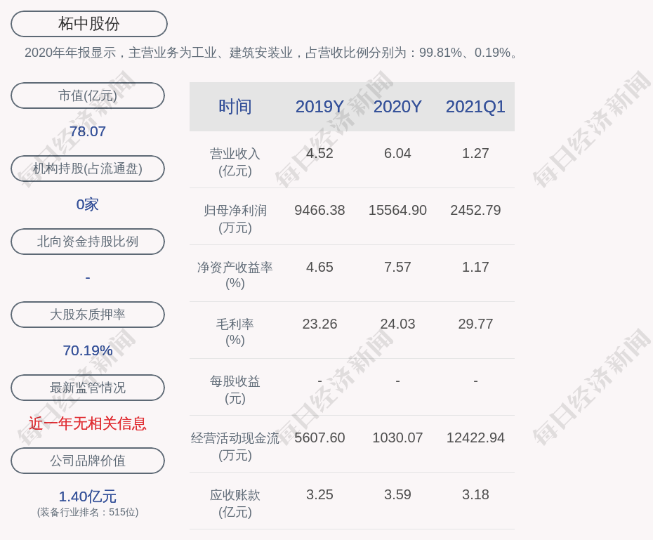 2020年年报显示,柘中股份的主营业务为工业、建筑安装业,占营收比例分别为:99.81%、0.19%。