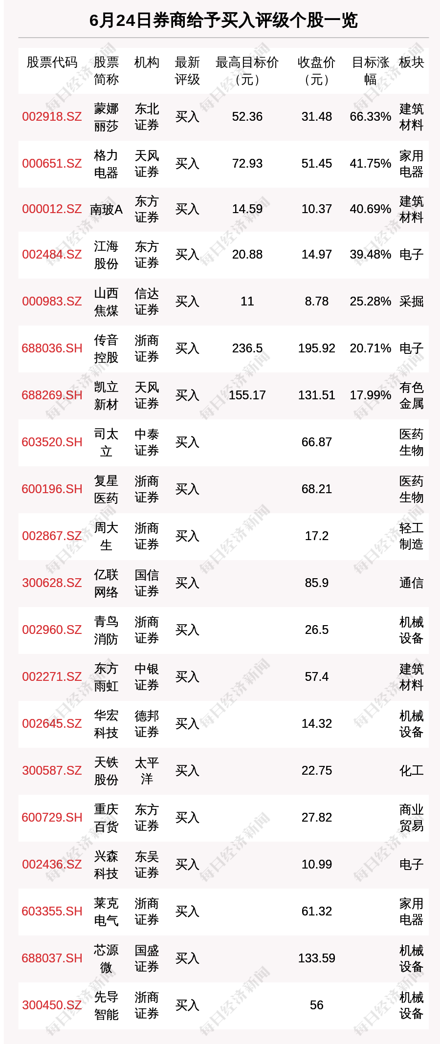 每经AI快讯,6月24日,券商给予评级的个股数共有28只,获得买入评级的个股数共有20只。在公布了目标价格的7只个股中,按照最新收盘价计算,预期涨幅排名居前的个股是蒙娜丽莎(002918.SZ)、格力电器(000651.SZ)、南玻A(000012.SZ),预期涨幅分别是66.33%、41.75%、40.69%。