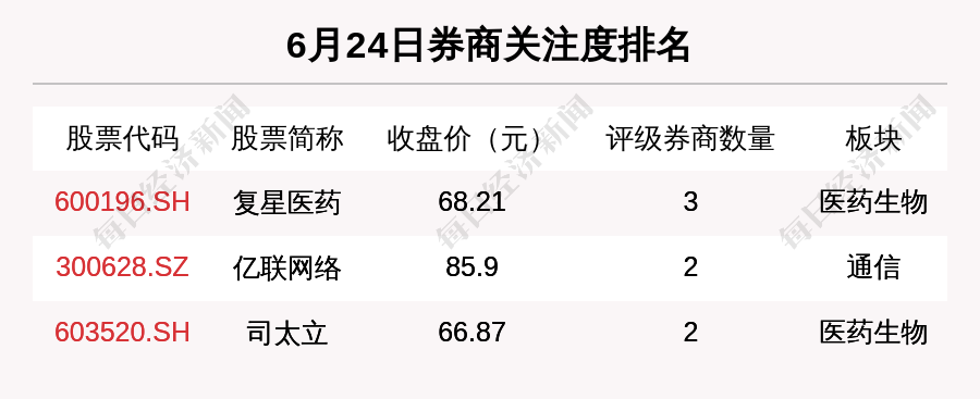 从券商对个股的关注程度来看,有3只个股获得多家券商关注,券商关注数量排名居前的个股是复星医药(600196.SH)、亿联网络(300628.SZ)、司太立(603520.SH)。