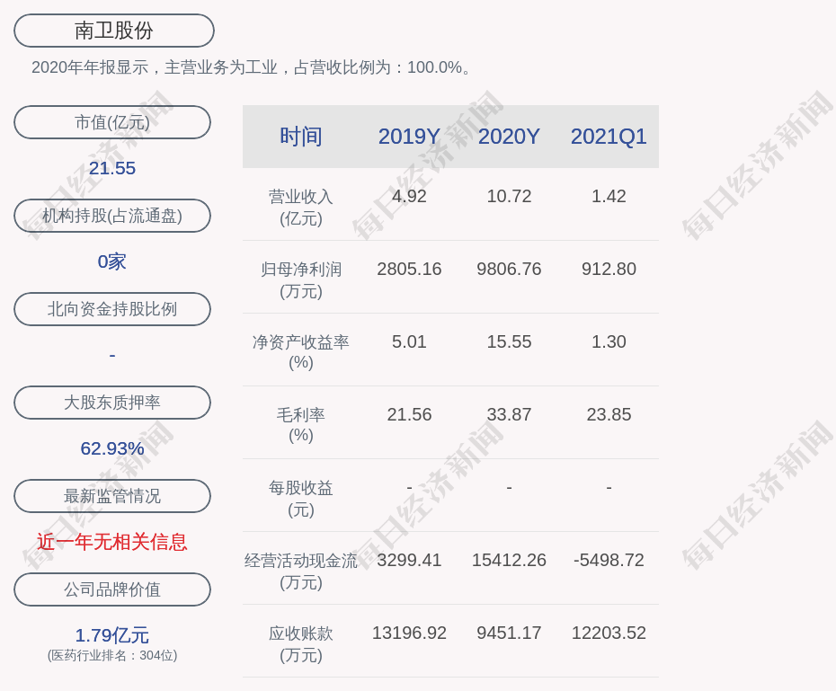 2020年年报显示,南卫股份的主营业务为工业,占营收比例为:100.0%。