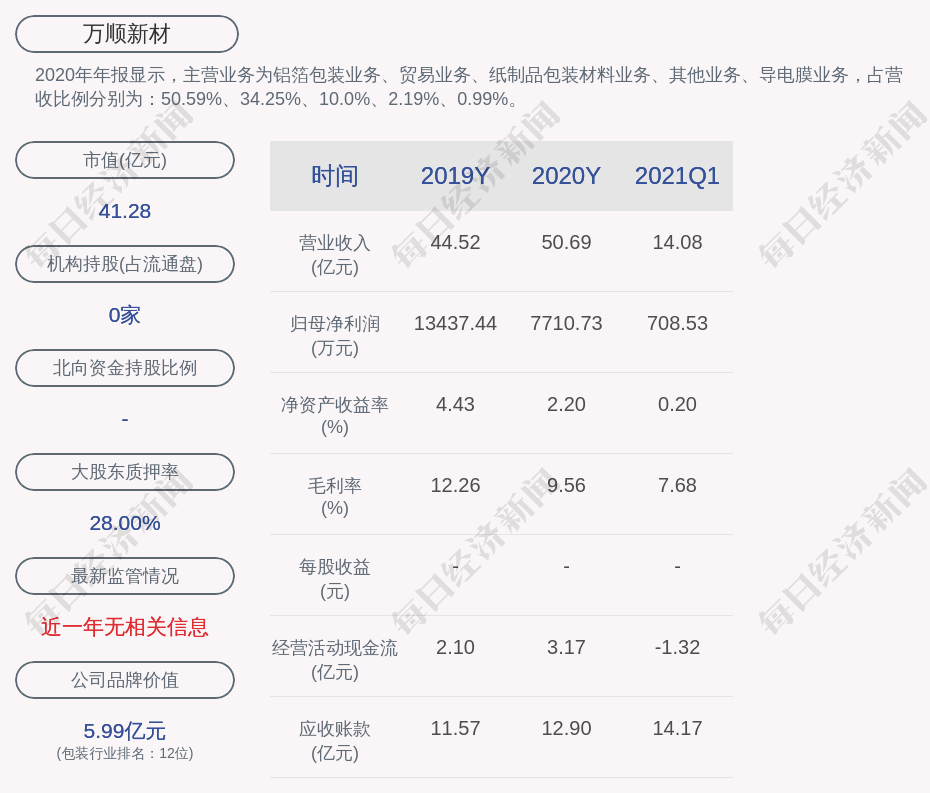 2020年年报显示,万顺新材的主营业务为铝箔包装业务、贸易业务、纸制品包装材料业务、导电膜业务等。