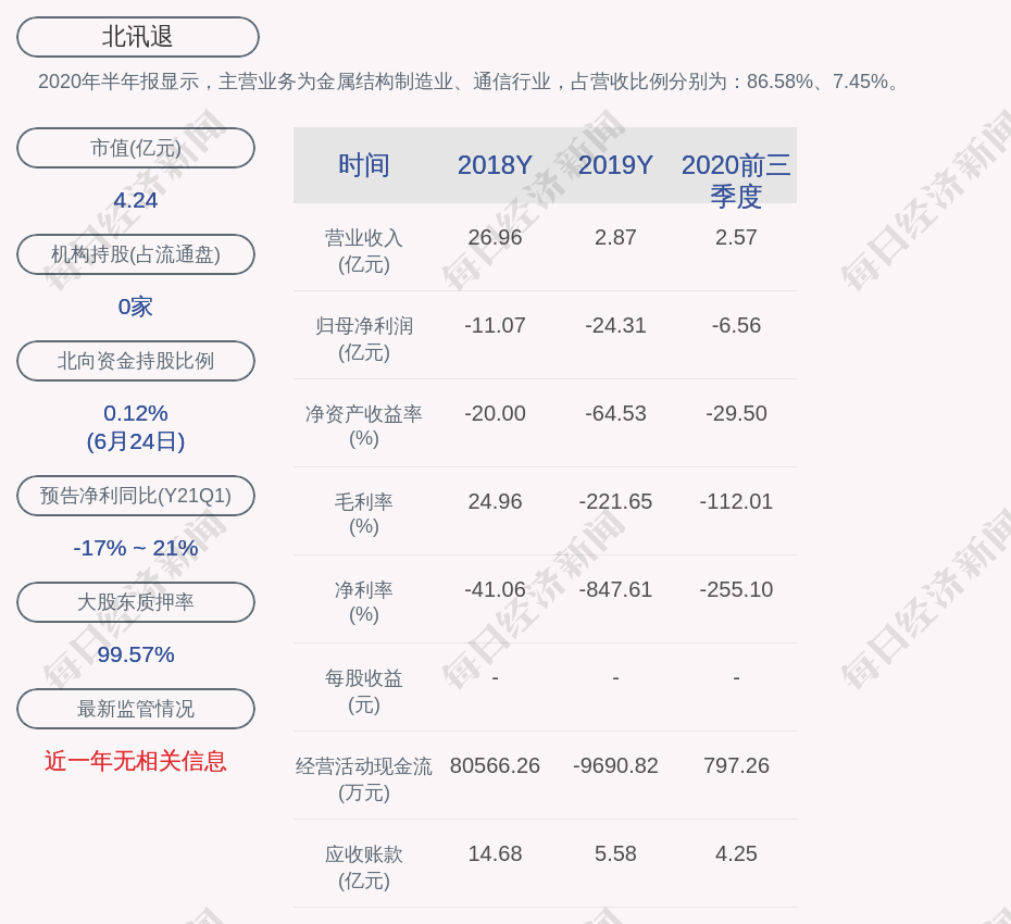 2020年半年报显示,北讯退的主营业务为金属结构制造业、通信行业,占营收比例分别为:86.58%、7.45%。