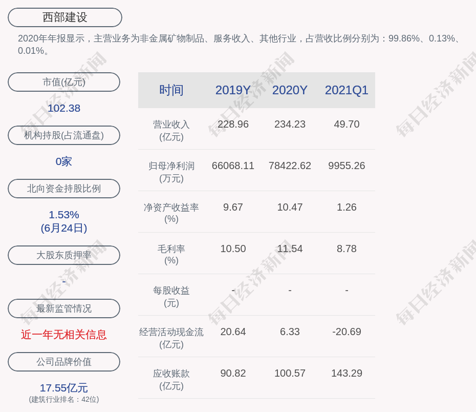 2020年年报显示,西部建设的主营业务为非金属矿物制品、服务收入、其他行业,占营收比例分别为:99.86%、0.13%、0.01%。