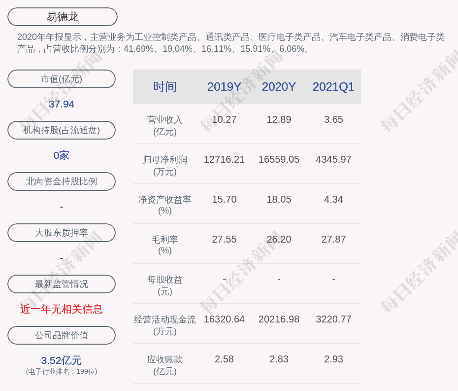 2020年年报显示,易德龙的主营业务为工业控制类产品、通讯类产品、医疗电子类产品、汽车电子类产品、消费电子类产品。