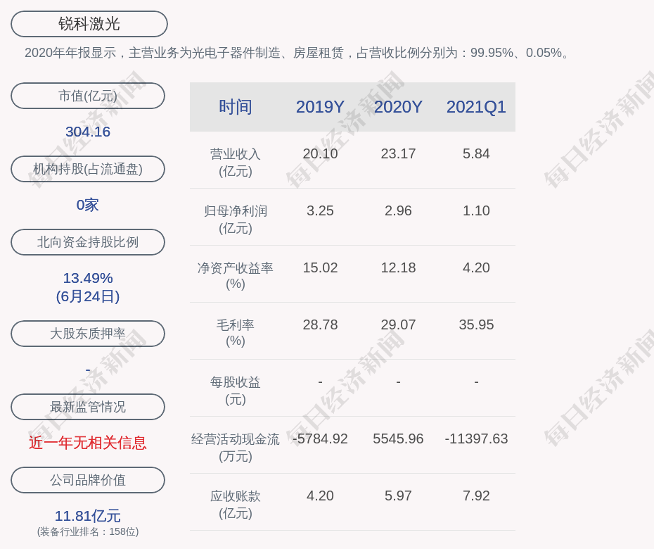 2020年年报显示,锐科激光的主营业务为光电子器件制造、房屋租赁,占营收比例分别为:99.95%、0.05%。