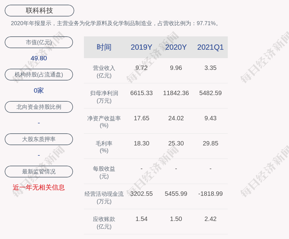 2020年年报显示,联科科技的主营业务为化学原料及化学制品制造业。