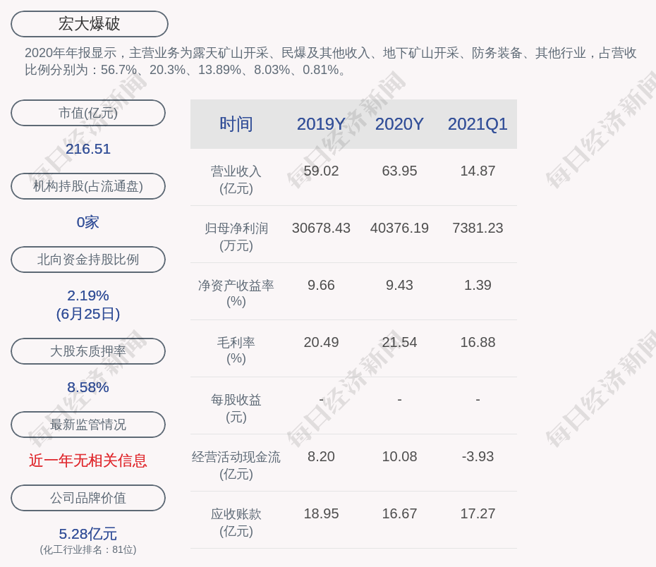 2020年年报显示,宏大爆破的主营业务为露天矿山开采、民爆及其他收入、地下矿山开采、防务装备、其他行业,占营收比例分别为:56.7%、20.3%、13.89%、8.03%、0.81%。