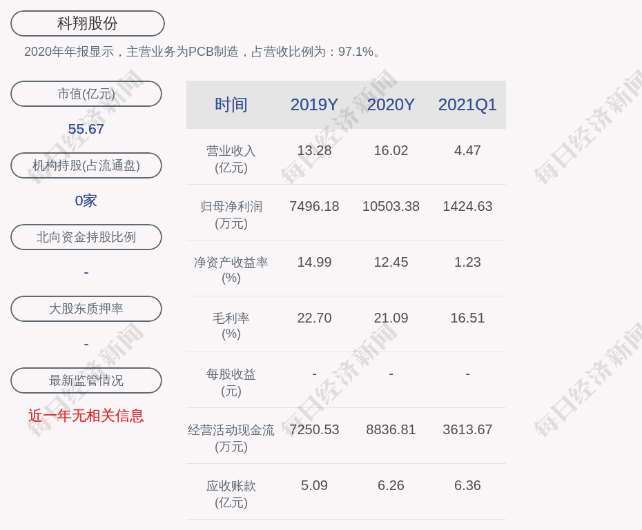2020年年报显示,科翔股份的主营业务为PCB制造,占营收比例为:97.1%。