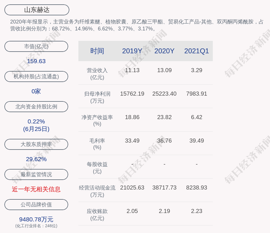 2020年年报显示,山东赫达的主营业务为纤维素醚、植物胶囊、原乙酸三甲酯、贸易化工产品-其他、双丙酮丙烯酰胺,占营收比例分别为:68.72%、14.96%、6.62%、3.77%、3.17%。