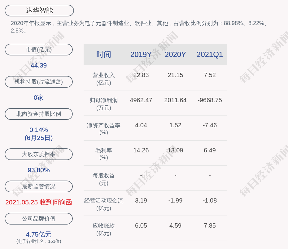 2020年年报显示,达华智能的主营业务为电子元器件制造业、软件业、其他,占营收比例分别为:88.98%、8.22%、2.8%。