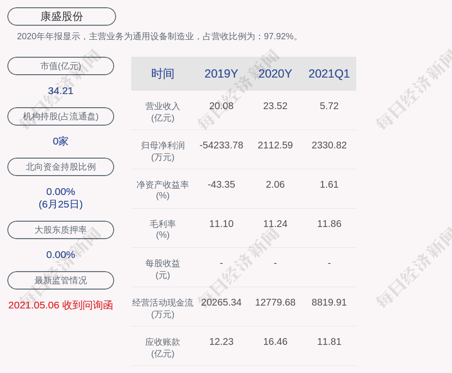 2020年年报显示,康盛股份的主营业务为通用设备制造业,占营收比例为:97.92%。