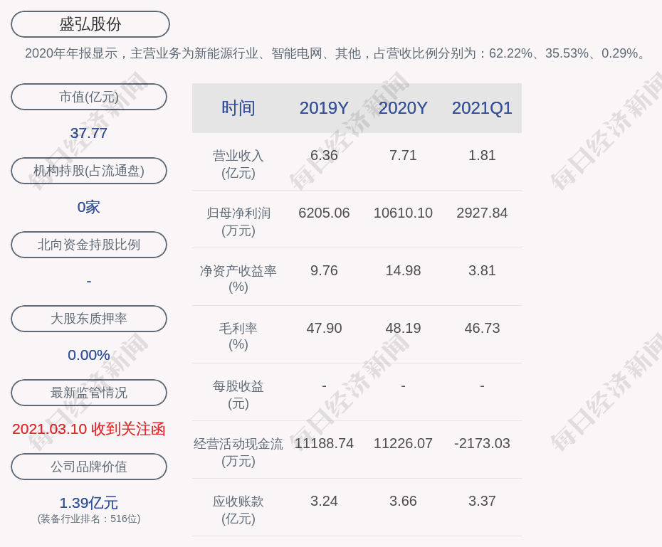2020年年报显示,盛弘股份的主营业务为新能源行业、智能电网、其他,占营收比例分别为:62.22%、35.53%、0.29%。