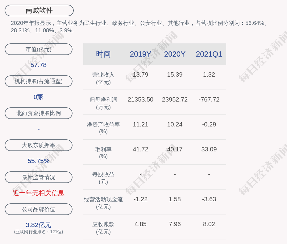 2020年年报显示,南威软件的主营业务为民生行业、政务行业、公安行业、其他行业,占营收比例分别为:56.64%、28.31%、11.08%、3.9%。