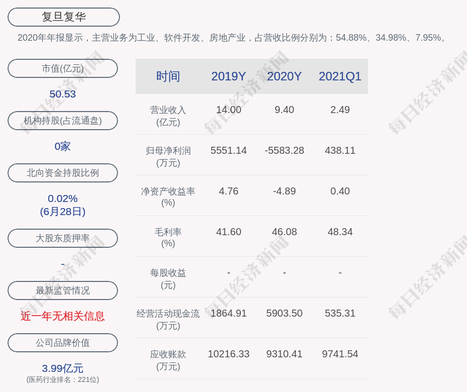 2020年年报显示,复旦复华的主营业务为工业、软件开发、房地产业,占营收比例分别为:54.88%、34.98%、7.95%。