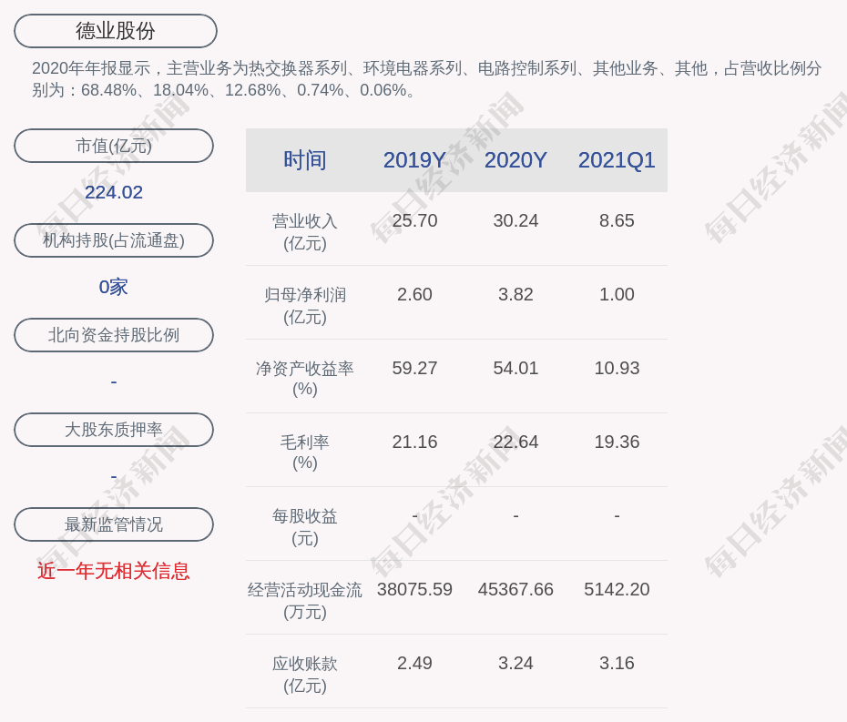 2020年年报显示,德业股份的主营业务为热交换器系列、环境电器系列、电路控制系列、其他业务、其他,占营收比例分别为:68.48%、18.04%、12.68%、0.74%、0.06%。