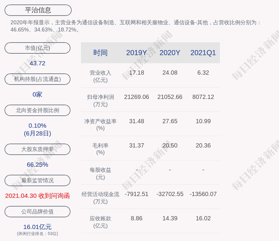 2020年年报显示,平治信息的主营业务为通信设备制造、互联网和相关服物业、通信设备-其他,占营收比例分别为:46.65%、34.63%、18.72%。