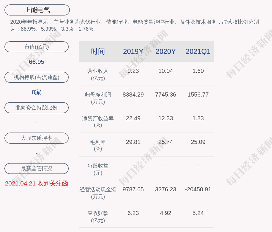 2020年年报显示,上能电气的主营业务为光伏行业、储能行业、电能质量治理行业、备件及技术服务,占营收比例分别为:88.9%、5.99%、3.3%、1.76%。