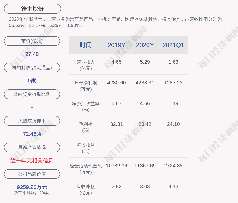 2020年年报显示,徕木股份的主营业务为汽车类产品、手机类产品、医疗器械及其他、模具治具。