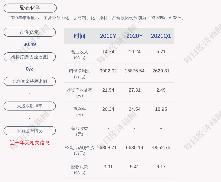 2020年年报显示,聚石化学的主营业务为化工新材料、化工原料,占营收比例分别为:93.59%、6.08%。