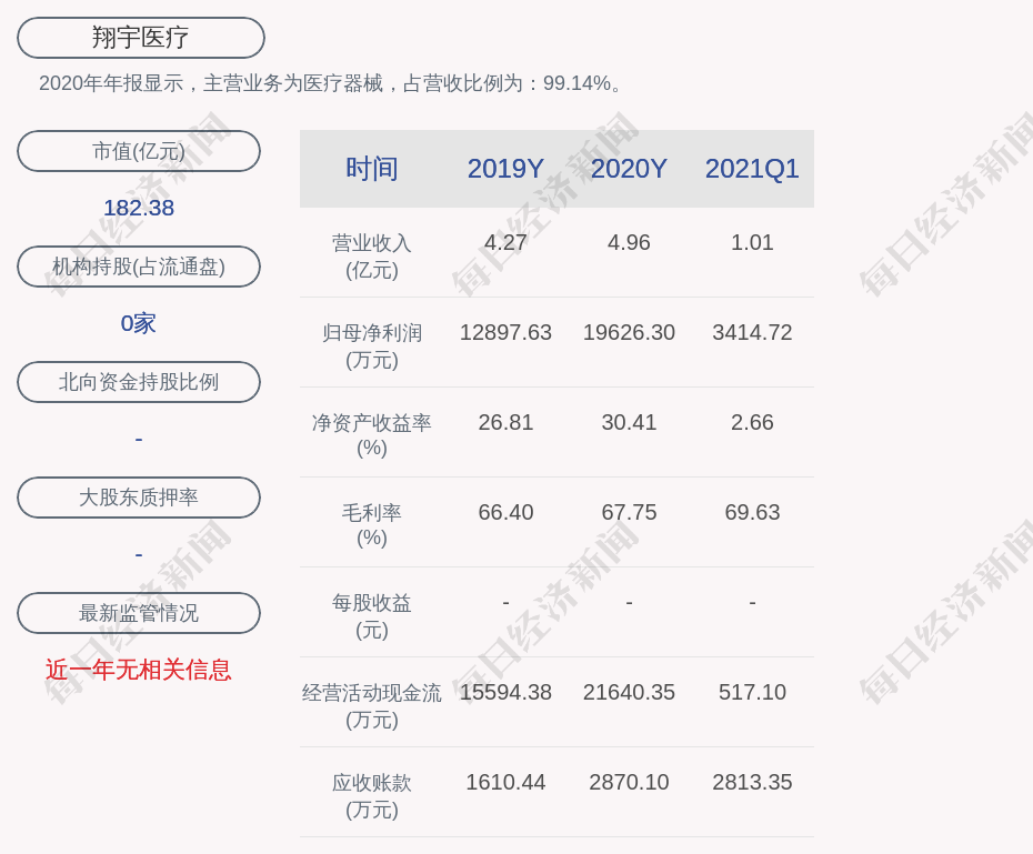 2020年年报显示,翔宇医疗的主营业务为医疗器械,占营收比例为:99.14%。