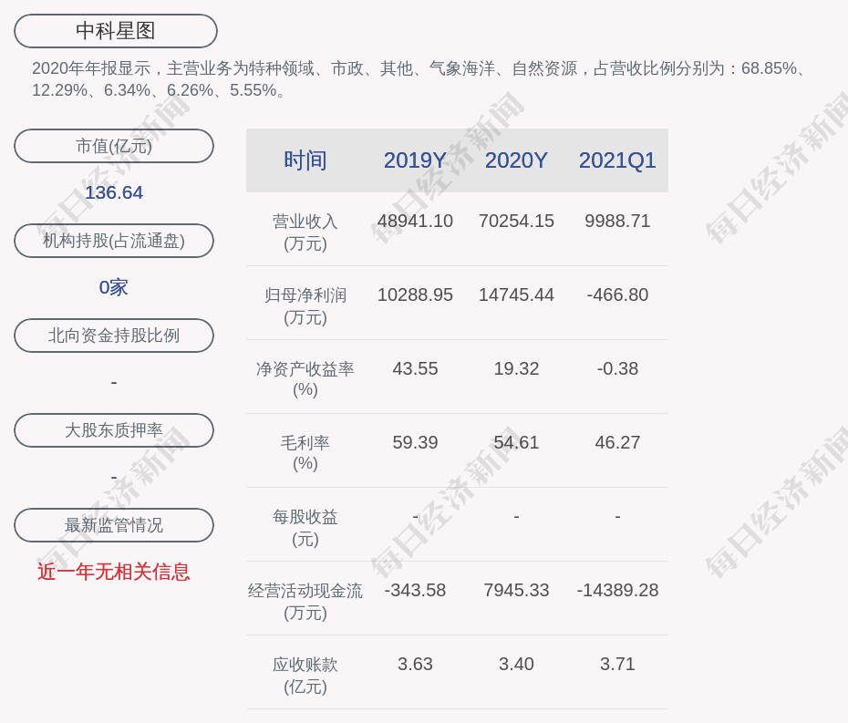 2020年年报显示,中科星图的主营业务为特种领域、市政、其他、气象海洋、自然资源,占营收比例分别为:68.85%、12.29%、6.34%、6.26%、5.55%。