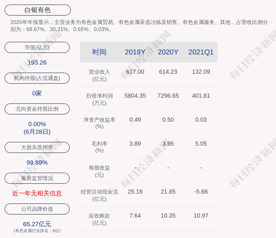 2020年年报显示,白银有色的主营业务为有色金属贸易、有色金属采选冶炼及销售、有色金属服务、其他,占营收比例分别为:68.67%、30.31%、0.65%、0.03%。