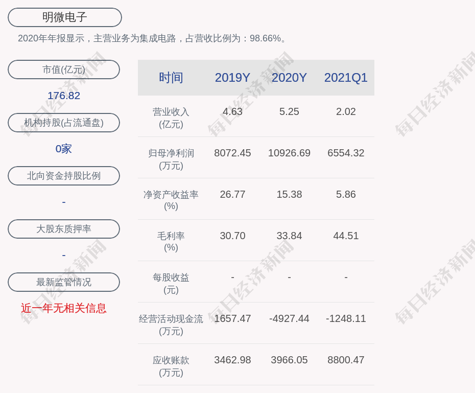 2020年年报显示,明微电子的主营业务为集成电路,占营收比例为:98.66%。