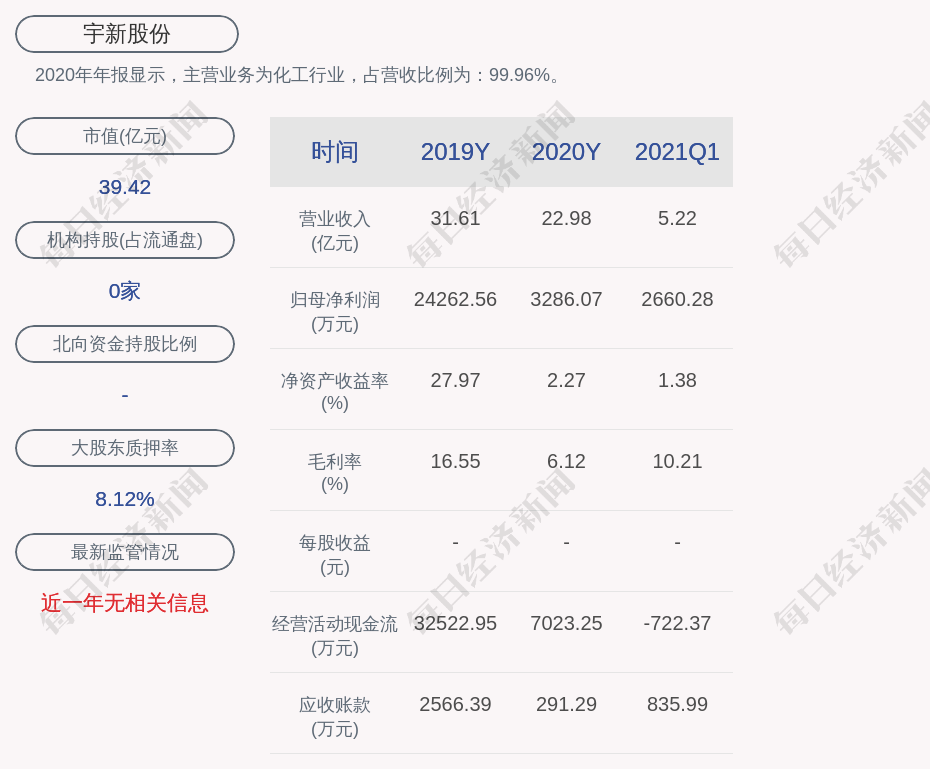 2020年年报显示,宇新股份的主营业务为化工行业,占营收比例为:99.96%。