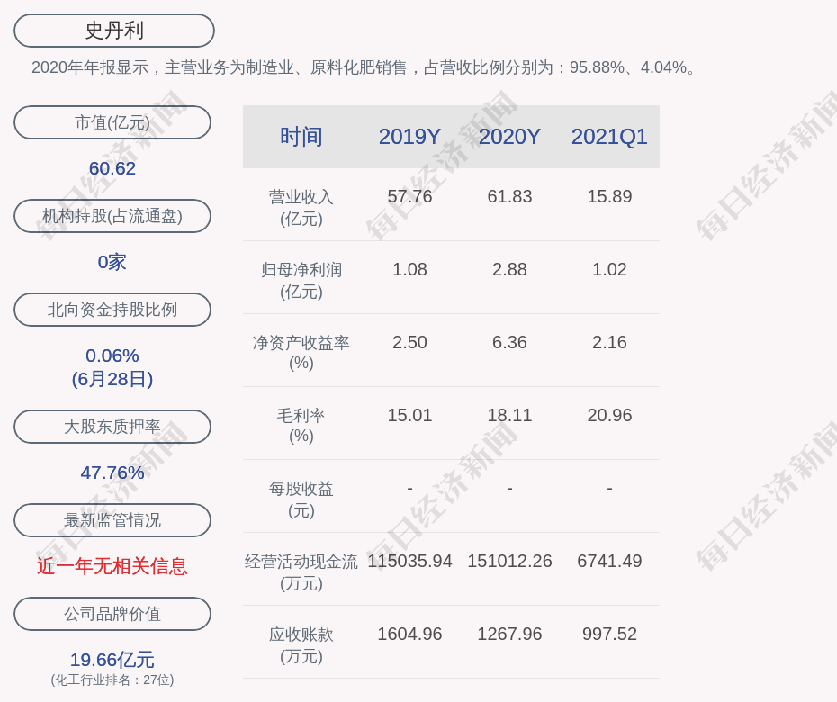 2020年年报显示,史丹利的主营业务为制造业、原料化肥销售,占营收比例分别为:95.88%、4.04%。