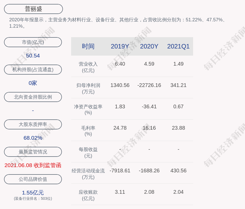 2020年年报显示,普丽盛的主营业务为材料行业、设备行业、其他行业,占营收比例分别为:51.22%、47.57%、1.21%。