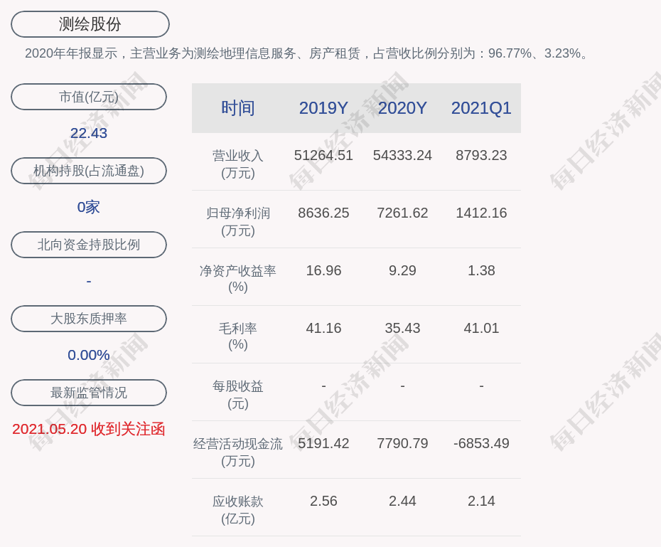 2020年年报显示,测绘股份的主营业务为测绘地理信息服务、房产租赁,占营收比例分别为:96.77%、3.23%。