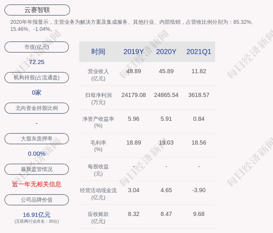 2020年年报显示,云赛智联的主营业务为解决方案及集成服务、其他行业、内部抵销,占营收比例分别为:85.32%、15.46%、-1.04%。
