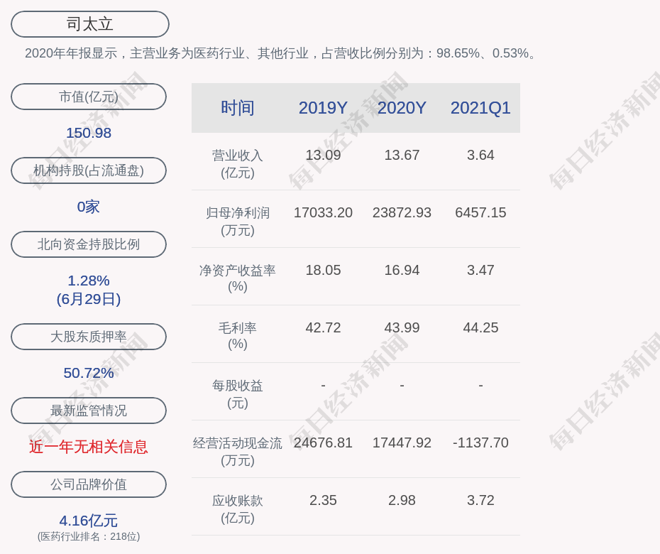2020年年报显示,司太立的主营业务为医药行业、其他行业,占营收比例分别为:98.65%、0.53%。
