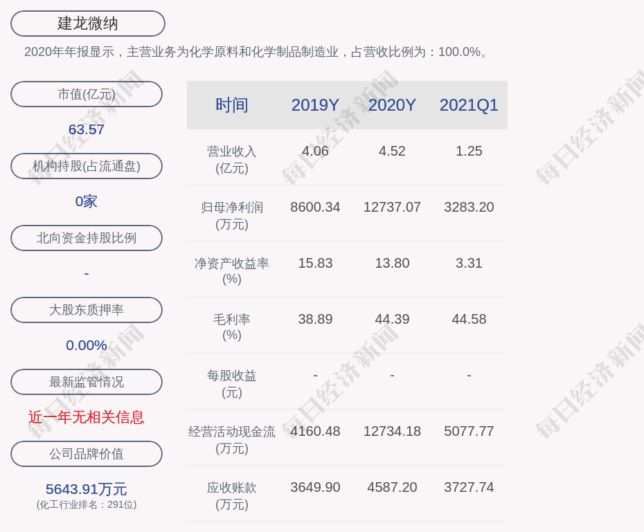 2020年年报显示,建龙微纳的主营业务为化学原料和化学制品制造业,占营收比例为:100.0%。