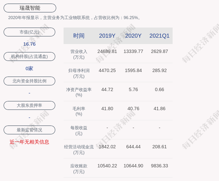 2020年年报显示,瑞晟智能的主营业务为工业物联系统,占营收比例为:96.25%。
