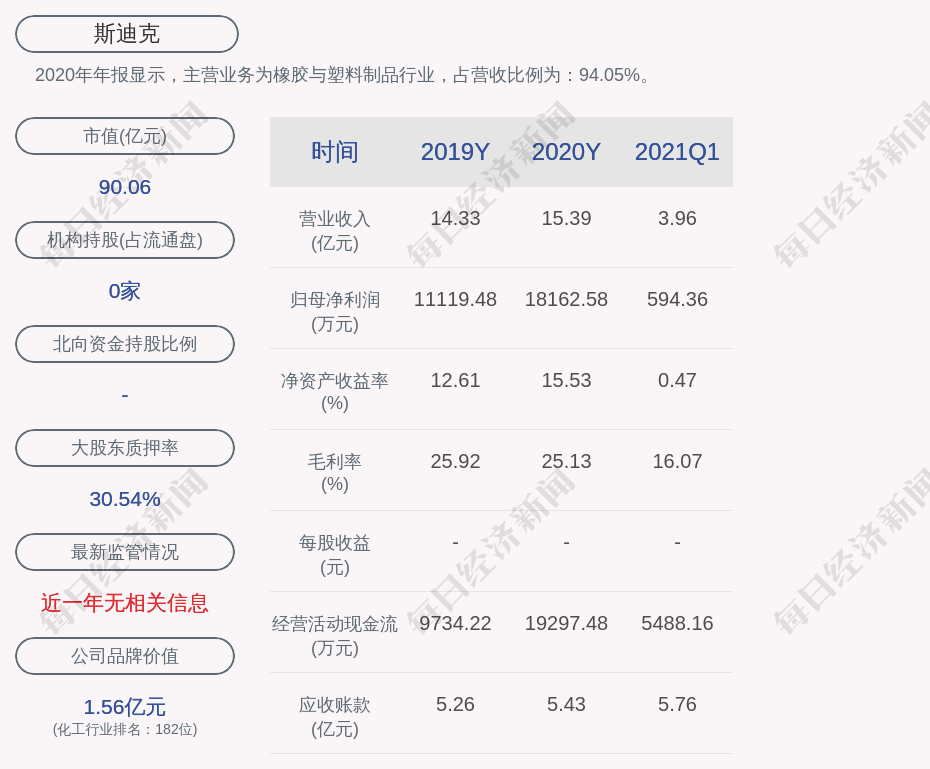 2020年年报显示,斯迪克的主营业务为橡胶与塑料制品行业,占营收比例为:94.05%。