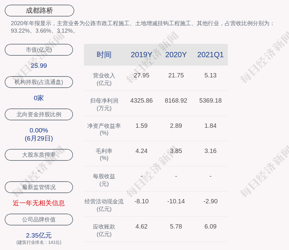 2020年年报显示,成都路桥的主营业务为公路市政工程施工、土地增减挂钩工程施工、其他行业,占营收比例分别为:93.22%、3.66%、3.12%。